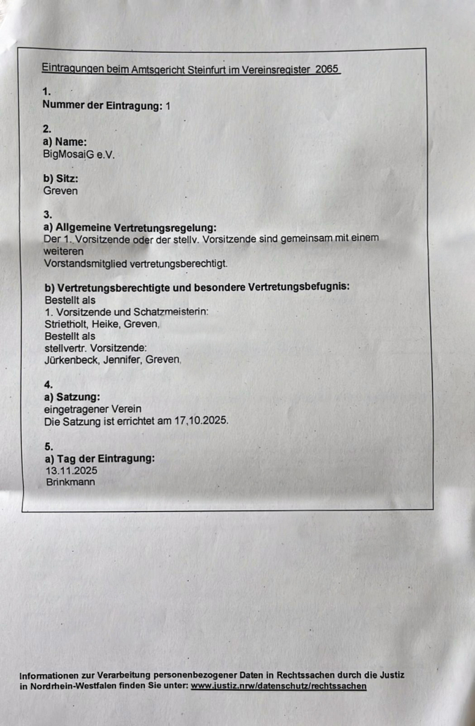 Das Projekt ist bereit für Kooperationen mit Kulturabteilungen, Ateliers, Schulen, Einrichtungen und Vereinen. Orte, Räume und Partner entstehen Schritt für Schritt – passend zum Wachstum von BigMosaiG.